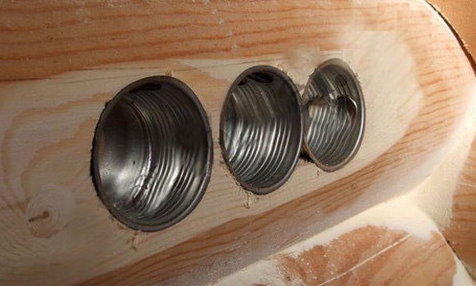 Предварительно делается разметка мест установки подразетников и маршрутов провода, который укладывается в жесткие или гофрированные металлические трубы. Оверстия для стаканов подрозетников сверлятся специальными коронками по дереву соответствующего диаметра. Провода прокладываются в прорезанных штробах, в подразетник заводятся через технологические отверстия проделанные с нескольких сторон. Штробы маскируются вагонкой или другими декоративными материалами. Этот способ существенно усложняет отделку.