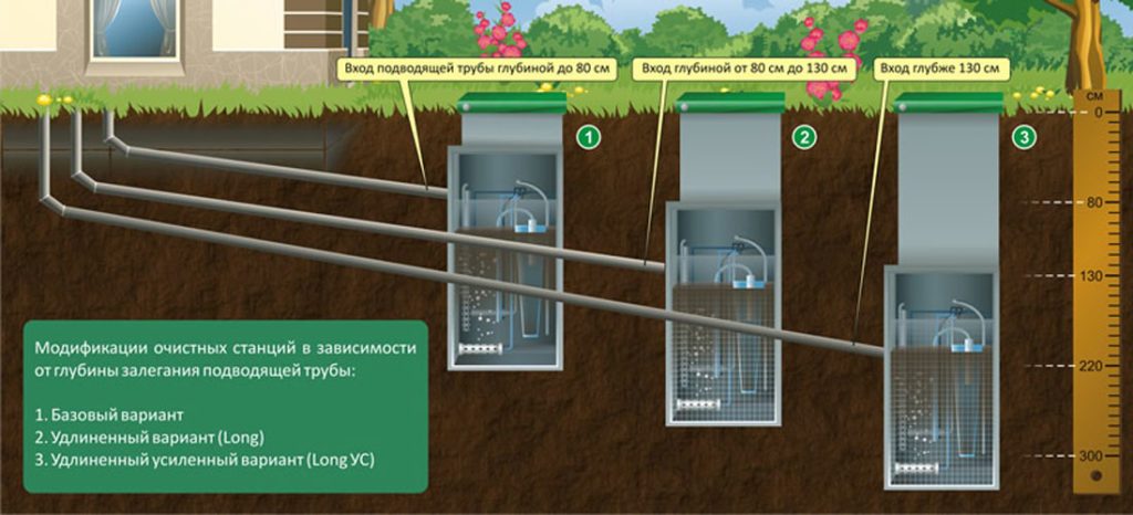Также септики делят на категории исходя из глубины заложения труб от дома. У них есть краткие характеристики, позволяющие без проблем определиться с выбором: