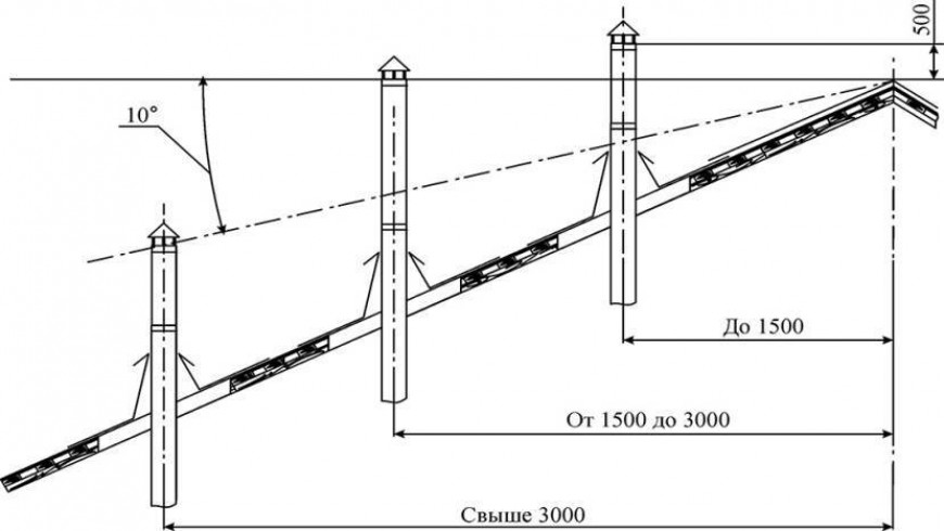 При близком расположении вытяжных труб к коньковому хребту на систему оказывается наименьшее давление ветра. Однако для формирования нормальной тяги вентиляционная труба (шахта) должна быть выше конька минимум на 0,5 м. Это требование не относится к аэраторам и кровельным вентиляторам, решающим задачи осушения кровельного пирога