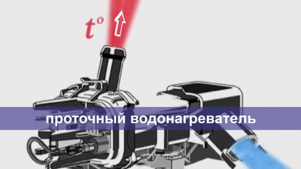 - Нагревательный элемент – проточный или классический. Обеспечивает нагрев воды до заданной температуры (максимальный предел редко превышает +70 градусов);