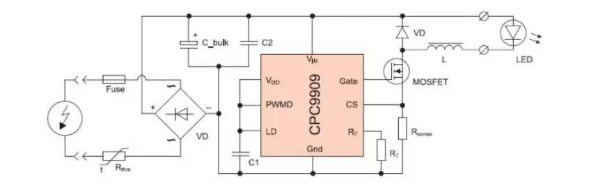 Практически у каждого производителя светотехнического оборудования существует своя схема устройства. Рассмотрим для примера микросхему СРС9909 компании Clare. Она используется для энергосберегающих и экономичных приборов, эффективность применения составляет 98%.