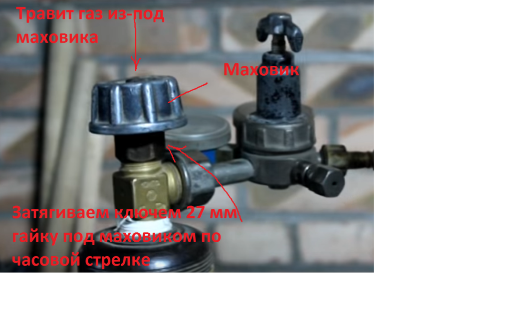 Если при попытке открыть маховик снова начинает травить газ с его верхней части, необходимо открутить его против часовой стрелки до упора, утечка должна прекратиться.