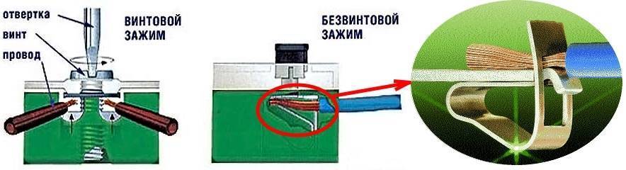 Безвинтовое соединение это по сути зажим на пружине – в который провод вставляется и затем фиксируется. Форма зажима препятствует самопроизвольному выпадению вставленной в него жилы, а пружина нивелирует вибрации вызываемые током, поэтому такое соединение не нуждается в периодическом подтягивание контактов.