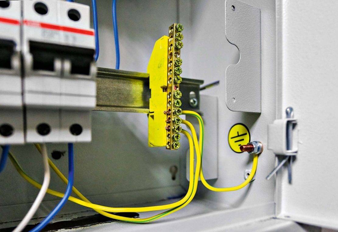 Металлическую «земляную» шину надо прикрепить к металлическому корпусу шкафа так, чтобы был хороший электрический контакт. Для этого в местах крепления, под болты, с корпуса счищают краску до чистого металла. Нулевую шину — на диэлектрическом основании — лучше крепить на дин-рейку. Такой способ установки выполняет основное требование — после разделения шины PE и N нигде не должны пересекаться (не должны иметь контакта).