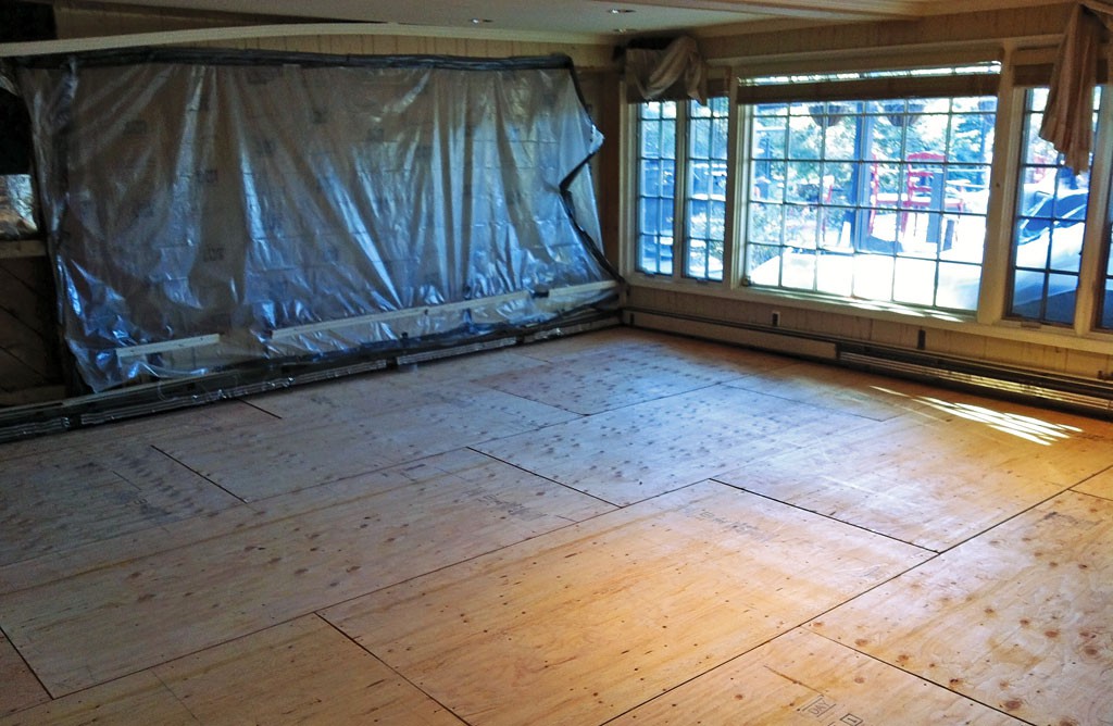 Доски чернового пола обязательно следует обработать антипиренами и антисептиками (Снеж, Финеста, Пинотекс). Щели между досками не должны быть боле 1 см. Далее на черновой пол укладывают гидроизоляцию.