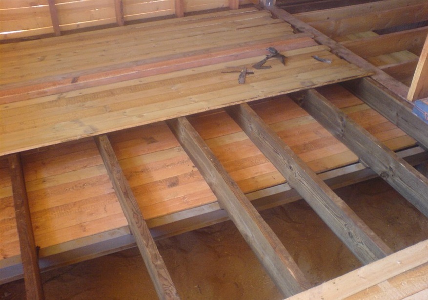 - на обрешетку прибивают черновой пол—дощатое покрытие, которое изготовлено из некондиционных досок. Вбивать доски нужно таким образом, чтобы гвозди не доставали до лаг;