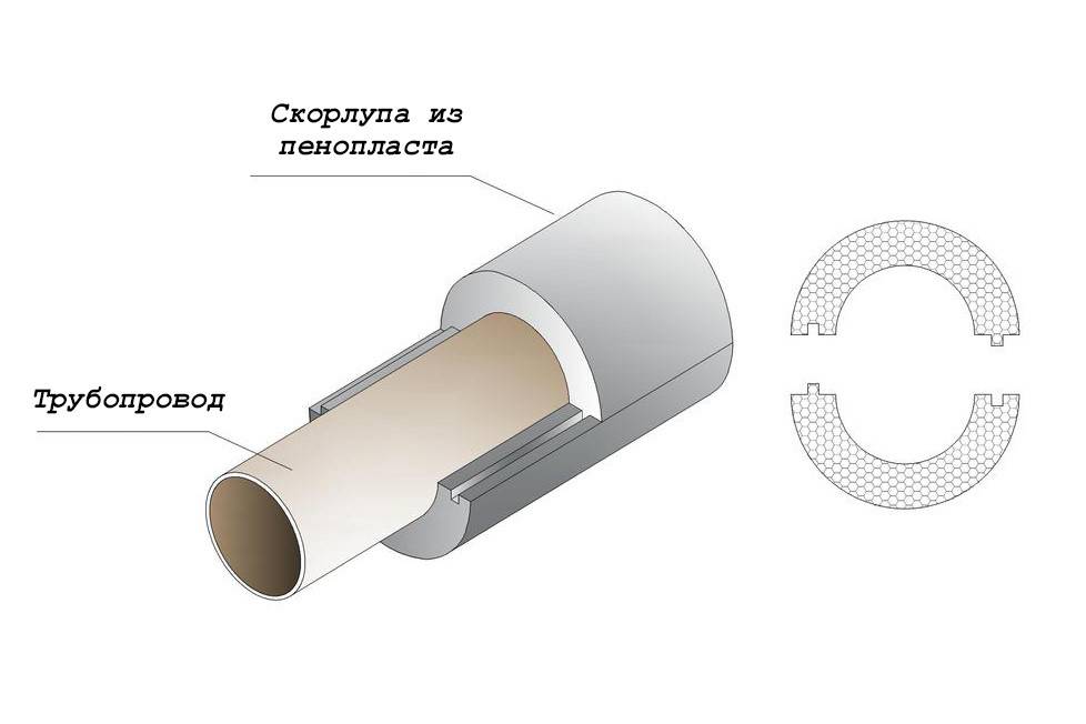 Скорлупы из пенопласта являются популярным изолятором для утепления труб канализации. Два процента его состава — мелкие, от 1 до 5 мм, полистирольные гранулы, остальные 98% — воздух. После обработки материала газообразователем гранулы приобретают легкость, упругость, притягиваются друг к другу и склеиваются.