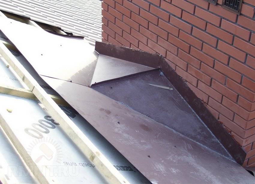 Детали фартука приклеивают внахлест, верхняя часть запускается под коньковый элемент, снизу влага попасть в кровельный пирог не сможет благодаря законам физики. При значительном удалении от конька запустить под него фартук не получится. В этом случае используют металлическую полосу, которая крепится по периметру (шаг саморезов 5 – 3 см), качественно огибая самые сложные конфигурации профиля листов металлочерепицы. Под фартук подкладывают резиновый уплотнитель либо используется герметик (рис.2)