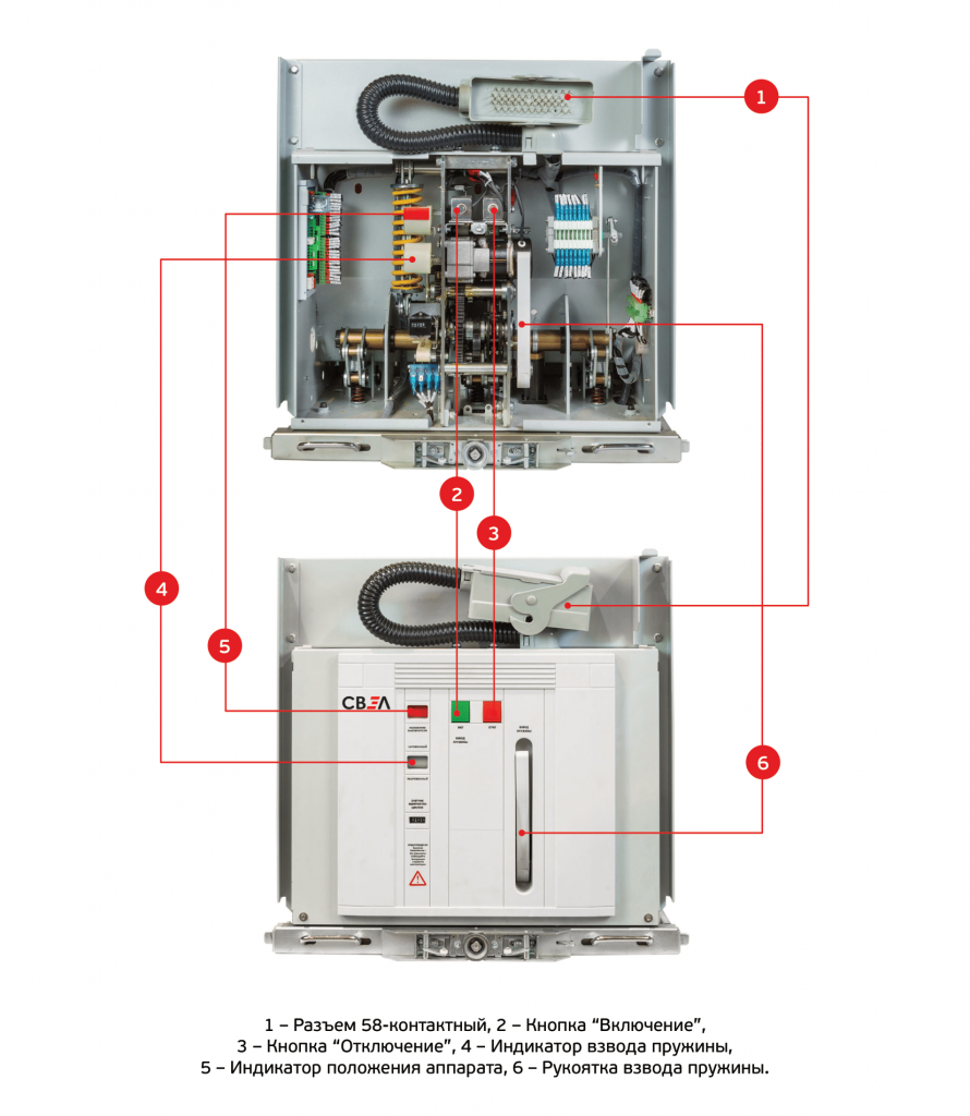 Устройства на напряжения до 35 кВ имеют три полюса, в каждом расположена камера и узел поджатия контактов (тяги), а пружинный привод.