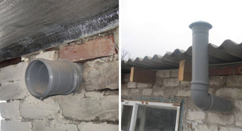 В верхней части, выходящей на улицу, в вытяжке из пластиковых труб следует поставить выпуклую круглую заслонку-грибок, которая защитит от попадания осадков в виде дождевых капель и снежных заносов.
