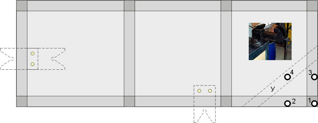 Тиски на слесарном верстаке устанавливаются в углу (см врезку на рисунке), чтобы как можно большая часть динамических нагрузок при металлообработке приходилась на угловую стойку вертикально. Размещение ригелей и промежуточных вертикальных стоек верстака со стационарными тисками желательно сделать слегка несимметричным, располагая их с меньшими интервалами в сторону угла с тисками. Установка тисков также осуществляется из уголка: