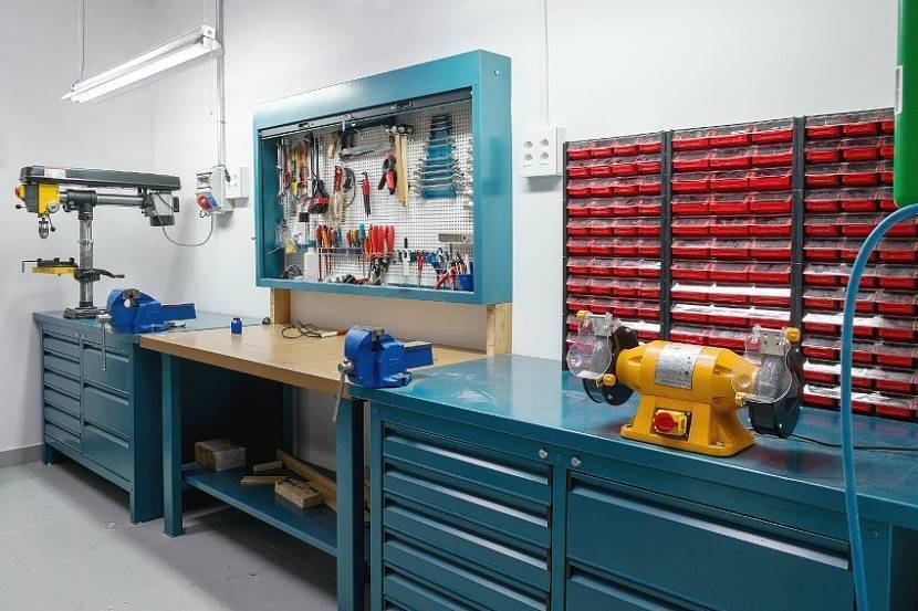 Также при обработке металлических деталей часто требуется усилие, использование острого инструмента, поэтому оптимальней всего оснащать верстак металлической столешницей.