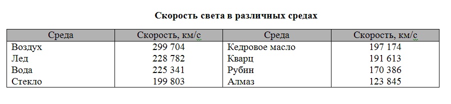 Не всегда угол преломления меньше угла падения, как в приведенных примерах. Если вспомнить, что свет – это электромагнитная волна, то значит, он обладает скоростью (300 000 км/с в вакууме). В веществах скорость света другая, всегда меньше.