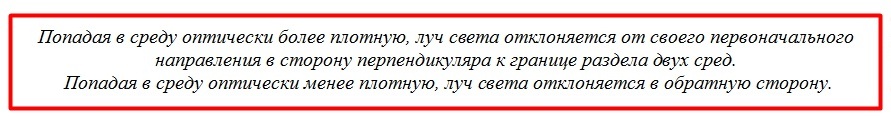Отсюда видно, что угол преломления может быть больше или меньше угла падения. Все объясняется оптическими свойствами среды, куда переходит световой луч.