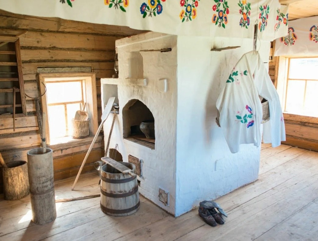 Классическая российская печь — это большое универсальное устройство. Хотя чугунная поверхность для варки тут отсутствует, в ней можно готовить еду. Большой и тяжелый корпус отлично греет помещение, а сверху есть полати — тёплая лежанка.