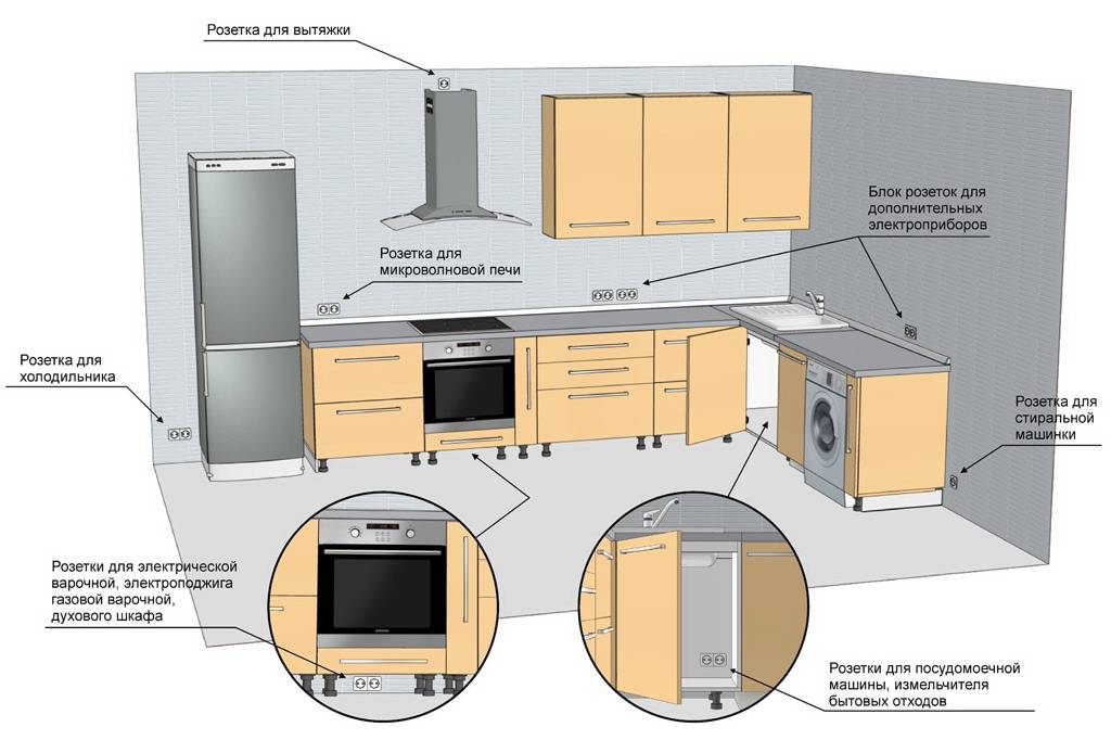 Так как кухня зачастую зона повышенной влажности, важно обеспечить водонепроницаемость электропроводки и контактов.