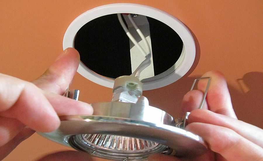 Далее он полностью отсоединяется от сети питания (предварительно нужно отключить подачу электричества в щитке). Затем меняется светильник на новый экземпляр. Подключив его к проводке, можно вставить его в исходное отверстие, опять придерживая пружины. После этого светильник готов к эксплуатации.