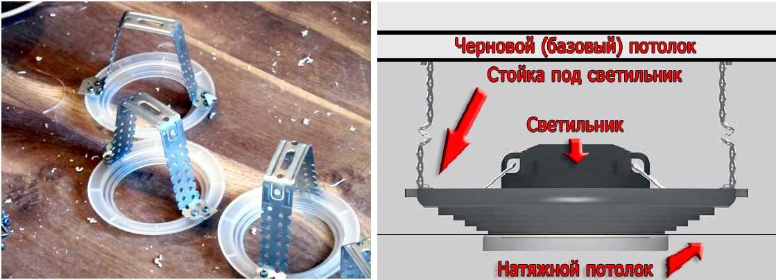 Такая конструкция на натяжных потолках неприемлема — у пленки или ткани явно не хватит несущей способности. Потому для натяжных потолков выпускают модели, к корпусу которых прикручен регулируемый подвес. Сам подвес крепится к основному потолку. Потом, после монтажа пленки или ткани, выставляют нужную высоту.