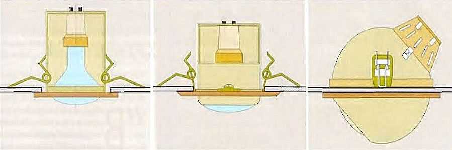 Точечные светильники для гипсокартонного или другого подвесного потолка на корпусе имеют подпружиненные распорки. Когда их вставляют в проделанное отверстие, распорки зажимают пальцами. Когда их разжимают, пружины отгибают эти «крылья». Именно они за счет силы упругости держат светильник.