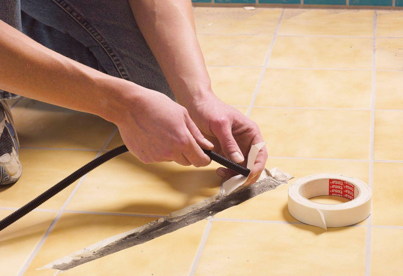 Для начала правильно разрежьте нагревательный мат: разрез делается по сетке в развёрнутом состоянии, после чего мат разверните в любом направлении. Разрез выполняется змейкой, чтобы не задеть ни один из кабелей. Конец сетки крепится у основания пола при помощи клея для кафельной плитки. Нужно дать ему время просохнуть. В это время нужно прикрепить при помощи алебастра холодные кабели