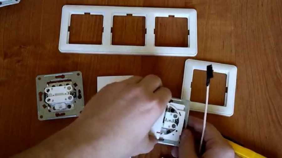 - Подготовка выключателя к монтажу. Необходимо разобрать выключатель, для этого, открутив винты, соединяющие кнопку с рамкой, нужно снять ее с рамки.