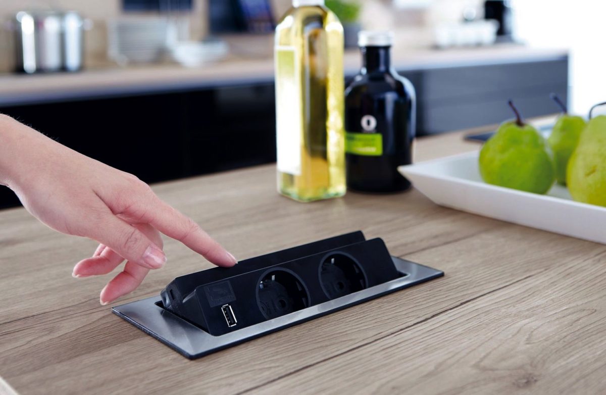 Встраиваемые розетки в столешницу – блок из 2-х и более розеток, вмонтированный в металлический или пластиковый корпус, который оснащён выдвижным механизмом. Устройство посредством лёгкого нажатия извлекается из столешницы и так же легко погружается в неё при нажатии. Устройство такого типа является своего рода сетевым фильтром, но при этом не имеет связок из проводки, которые так не эстетично выглядят. Современный рынок предлагает пользователям несколько разновидностей устройств выдвижного типа.