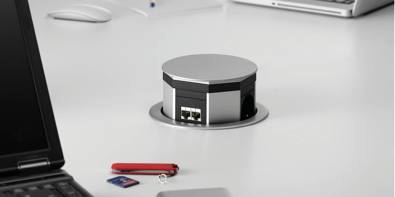 Выдвижная розетка представляет собой вставной компонент, который устанавливается непосредственно в верстак или мебельный шкаф. Доступ к розеткам осуществляется путем нажатия на крышку системы, что приводит в действие выдвижной механизм.