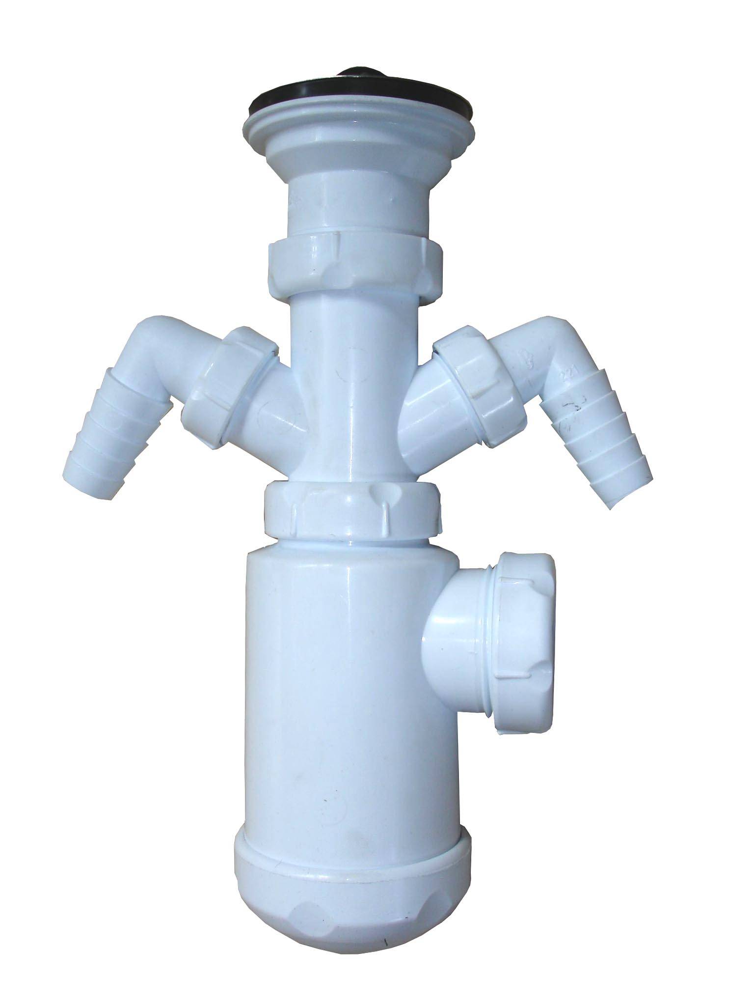 - Сифон для стока с двумя или одним штуцером. Двойной штуцер необходим для тех, у кого нет стиральной автоматической машинки. К нему можно подключать одновременно два слива, как стиральной, так и посудомоечной машины. Если вы не планируете устанавливать «стиралку» на кухне, или уже имеете отдельный для неё слив, купите сифон с одним штуцером.