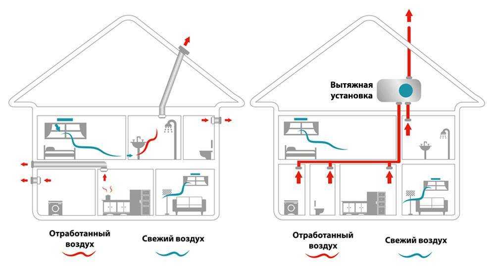 Вытяжной принцип уже немного описан выше: воздух удаляется через вентиляционный канал, а новый поступает извне. Приточное вентилирование организовано иначе: воздух нагнетается снаружи и вытесняется через канал.
