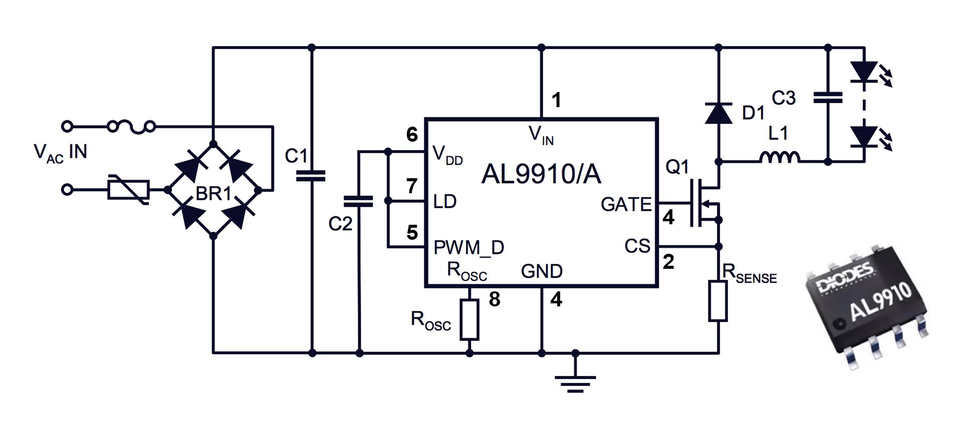 Diodes Incorporated создала одну весьма интересную микросхему драйвера светодиодов: AL9910. Любопытна она тем, что ее рабочий диапазон напряжений позволяет подключать ее прямо к сети 220В (через простой диодный выпрямитель).