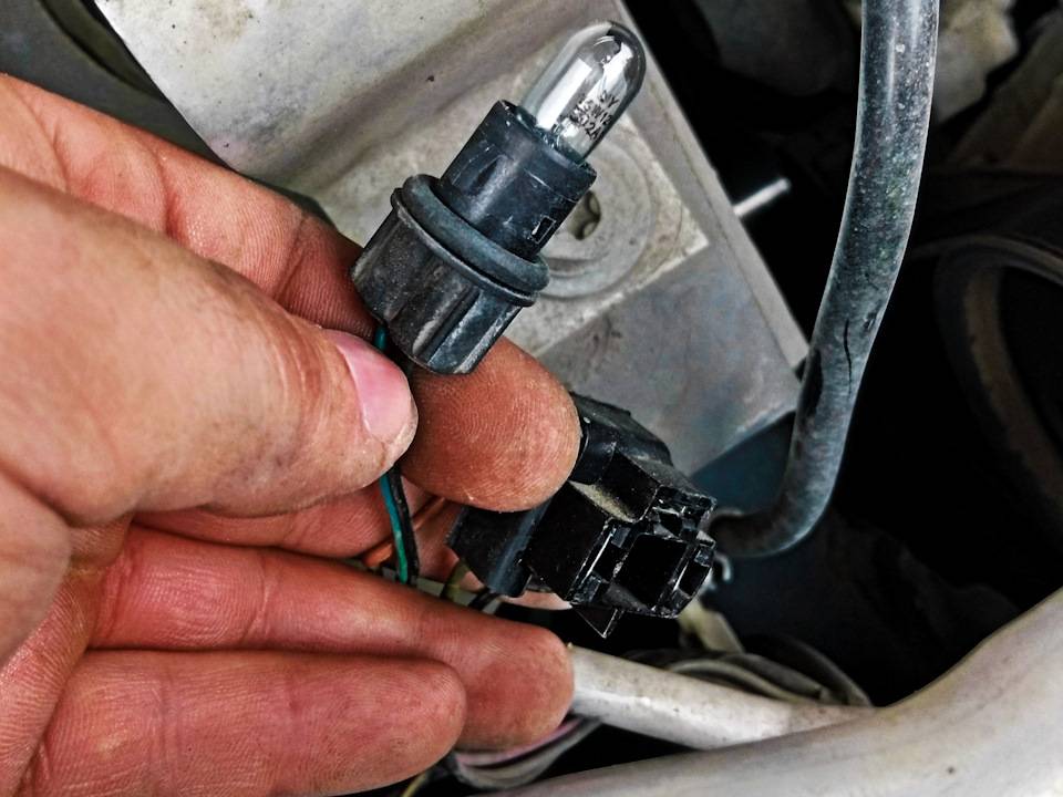 Подбираемся к цоколю лампы габаритов, проворачиваем, вынимаем, меняем. Все так же, как и с другой стороны. Если нужно, проверяем лампу включением габаритов. Не теряем из виду колодку проводов, нам ее еще на место ставить.