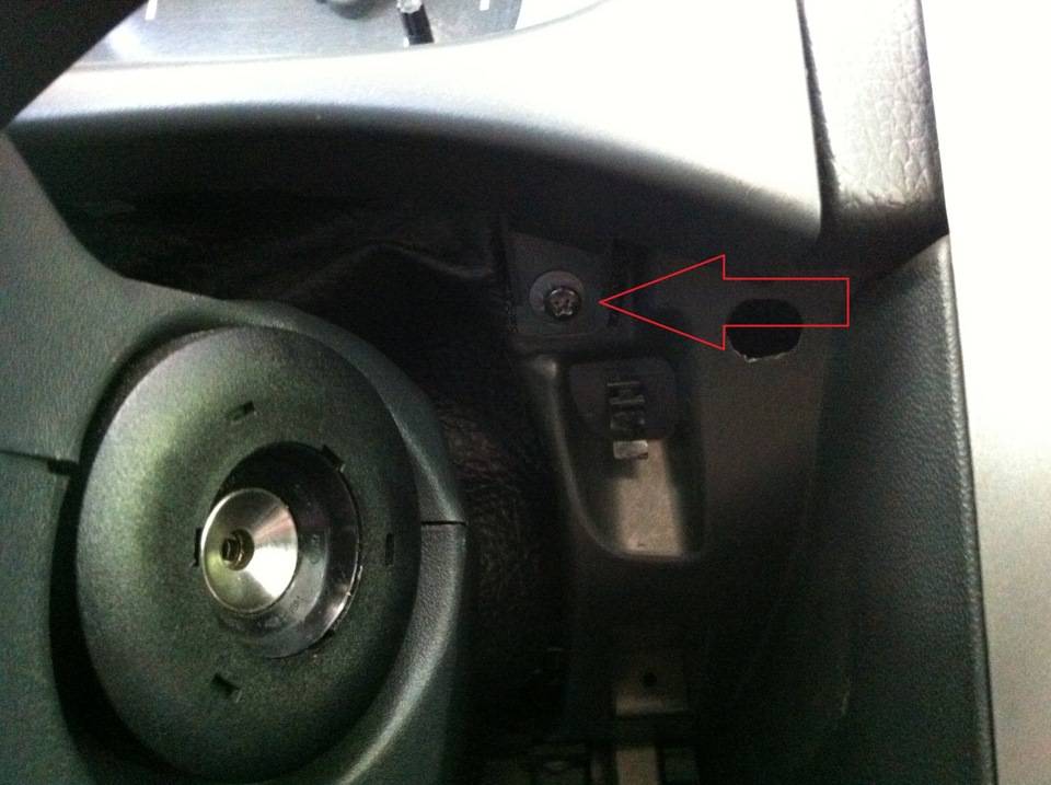 Снимаем панель под рулевой колонкой (сверху просто отщелкиваем, снизу поворачиваем 3 пластиковых крепления). Если приходилось менять предохранители, то снять панель не составит труда.Видим еще 2 болта (один слева, другой справа)