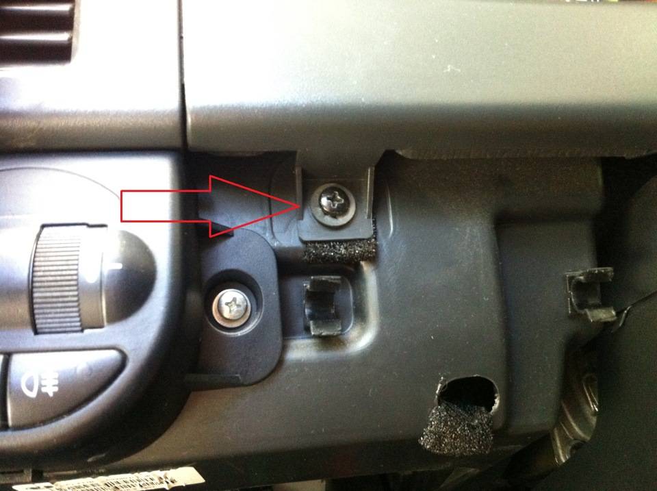 Крестообразной отверткой отворачиваем саморез бокового крепления панели приборов. Аналогично отворачиваем саморез с правой стороны панели приборов. Открываем вещевой ящик…