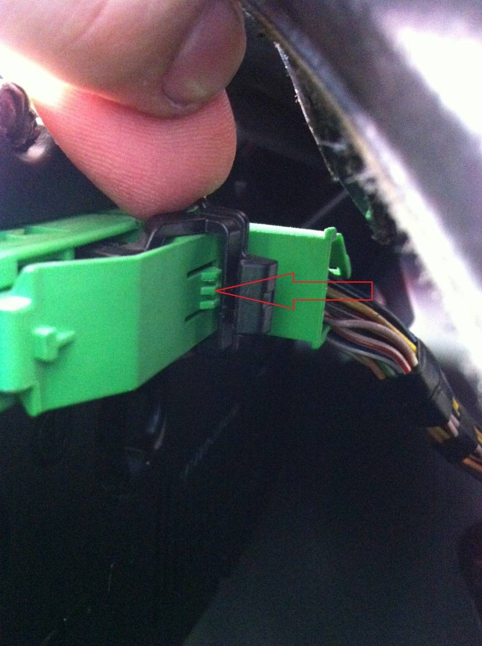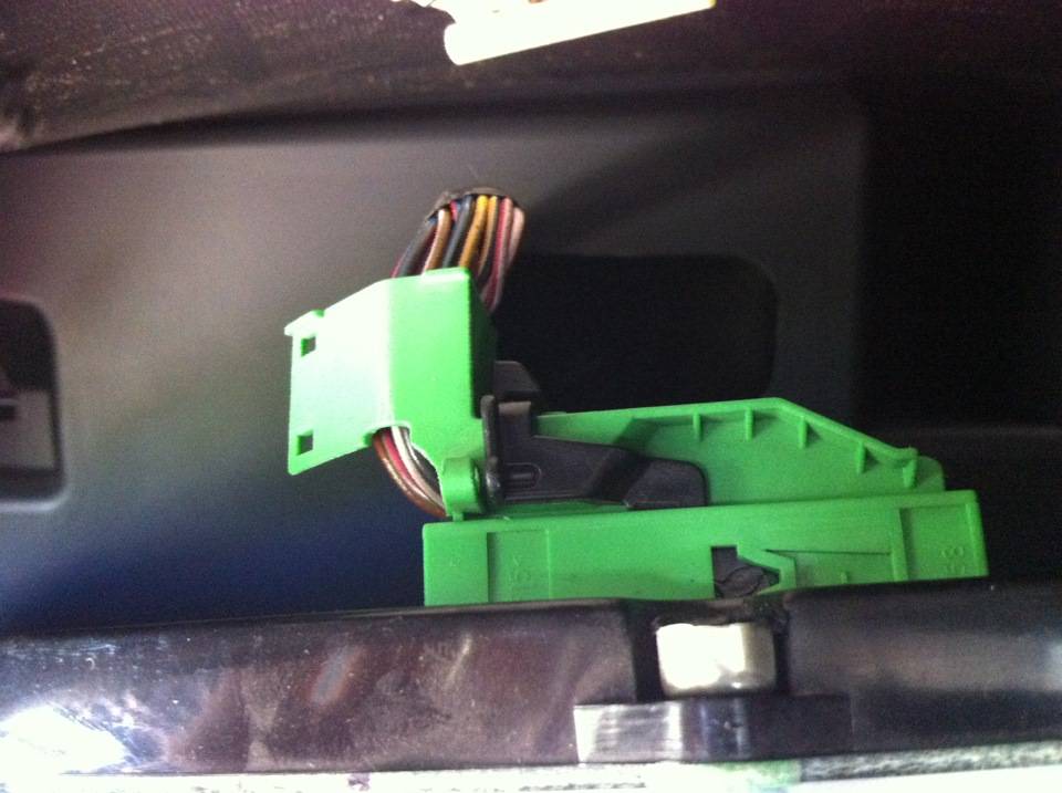 Видим зеленую колодку сзади панели. Отсоединить её просто, но первый раз неудобно. Слегка нажимаем на язычок-упор отверткой и тянем черный рычаг вверх. Штекер сам выйдет из гнезда.