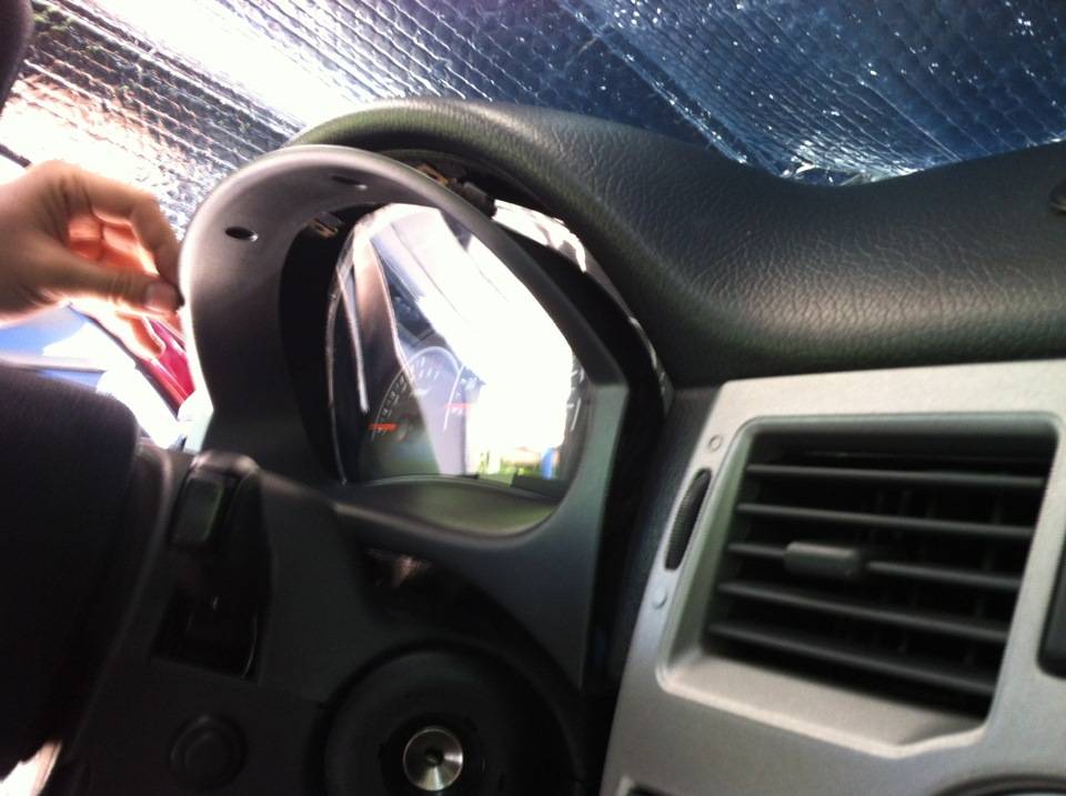 Далее снимаем декоративную накладку, которую мы открутили. Опускаем руль в самое нижнее положение и вытаскиваем накладку. Руль снимать НЕ НАДО!