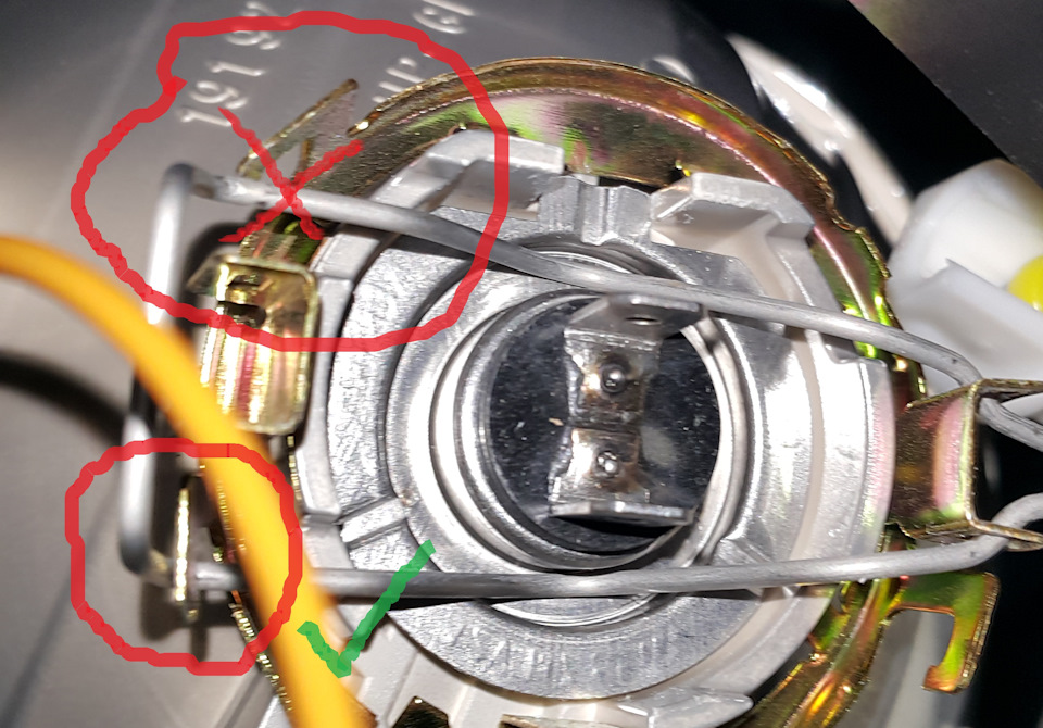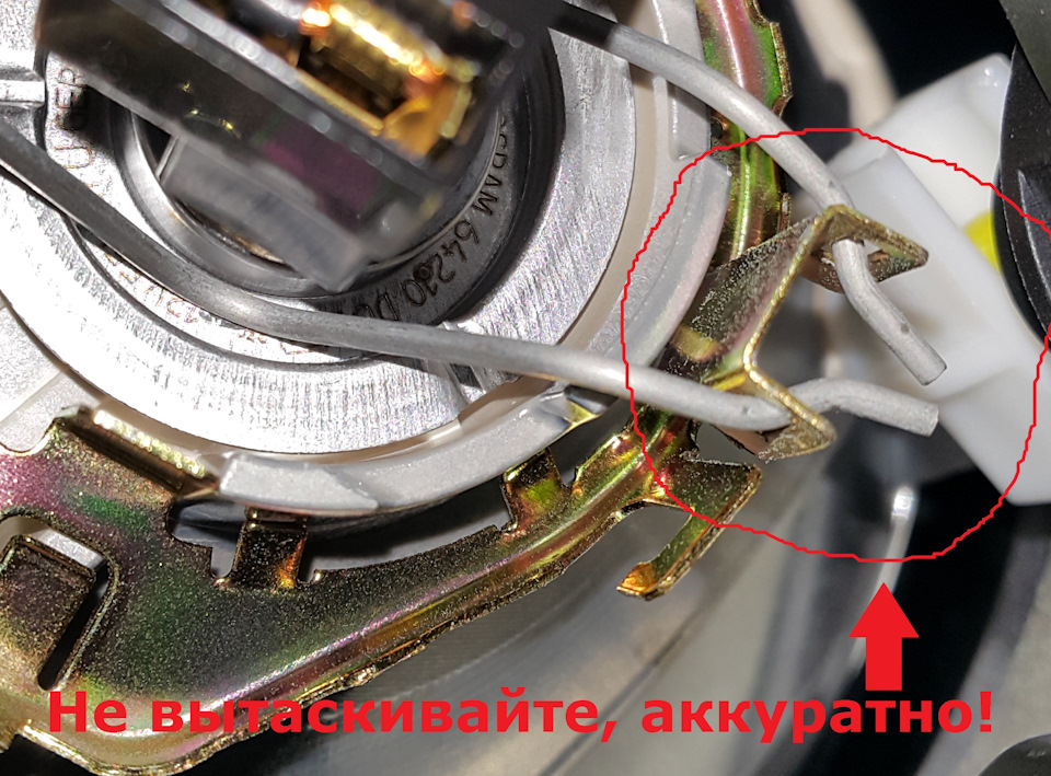 Итак, вставляем лампу!1. Засовываем лампу, язычек сверху (на фото). Так же видно на фото, как я отвел в сторону “усы” (пружинный фиксатор) а не вытащил их полностью. Удобнее, если в это время смотреть снаружи на фару. Легче сувать