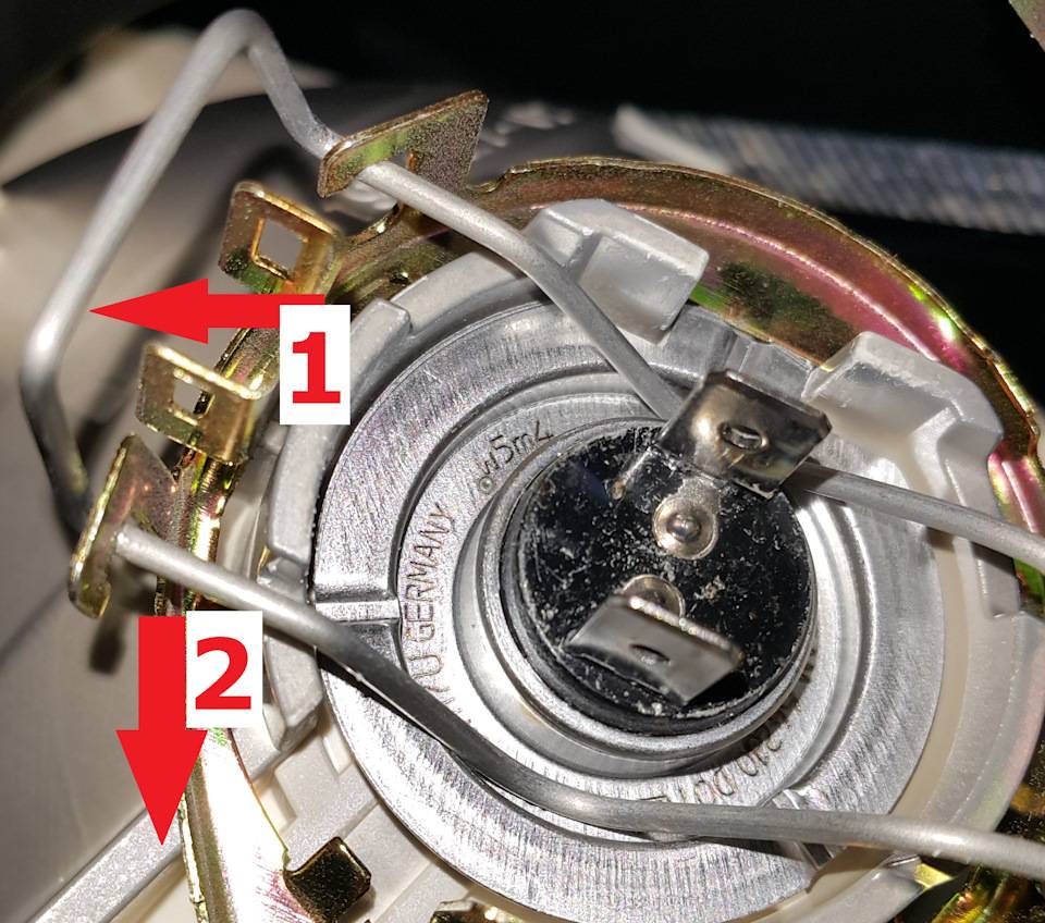 Рекомендация. В какую сторону направлены проушины фиксатора, можно увидеть на сделанном ранее фото. Вынимать пружину целиком не следует – вставить ее назад будет нелегко. Просто откиньте фиксатор и вынимайте лампочку.
