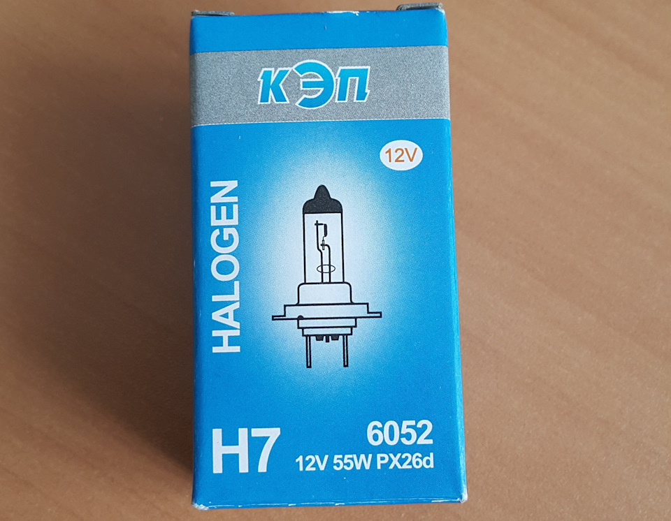 Ну что, я по накатанной — в первый попавшийся магазин с надписью АВТОВАЗ и со словами “дайте самую дешманскую лампу H7 на калину2“.В общем за 100 руб. шт. взял парочку ламп какой-то фирмы: КЭП H7 6052 12V 55W PX26d