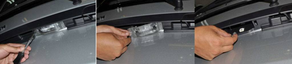 Для этого откройте дверь багажного отделения и отверните две пластиковые гайки крепления фонаря. После чего его можно демонтировать и произвести все необходимые манипуляции: