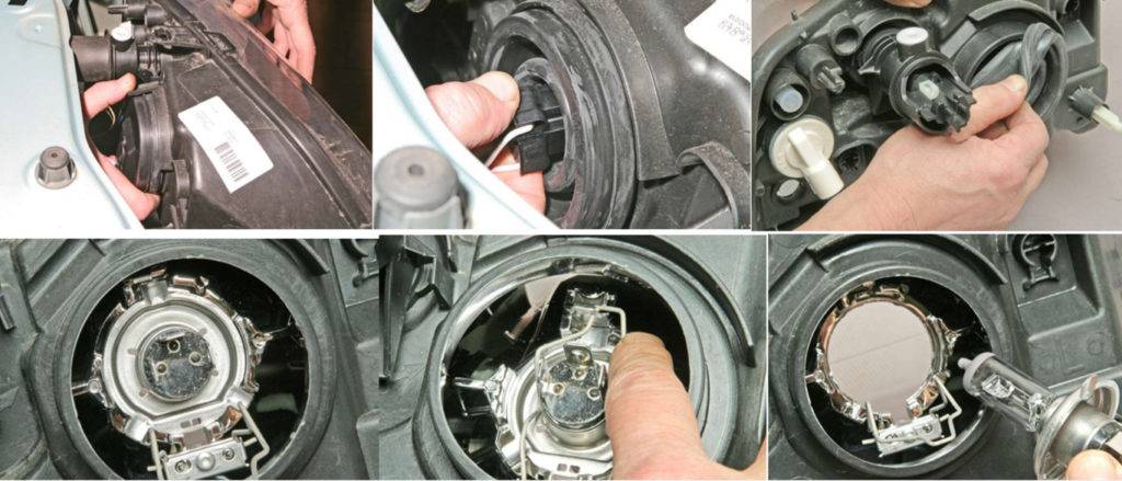 осторожно отпустив держатель, аккуратно достают сгоревшую лампу. Новую лампу вставляют в отверстие отражателя и закрепляют с помощью штатного крепежа