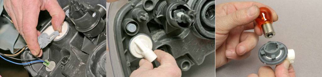 - проворачивают патрон по (левая лампа) или против (правая лампа) часовой стрелки и вынимают его из корпуса блок-фары;