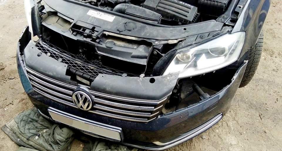 демонтировать бампер — крепится несколькими болтами к передку кузова сверху и снизу на кронштейнах;
