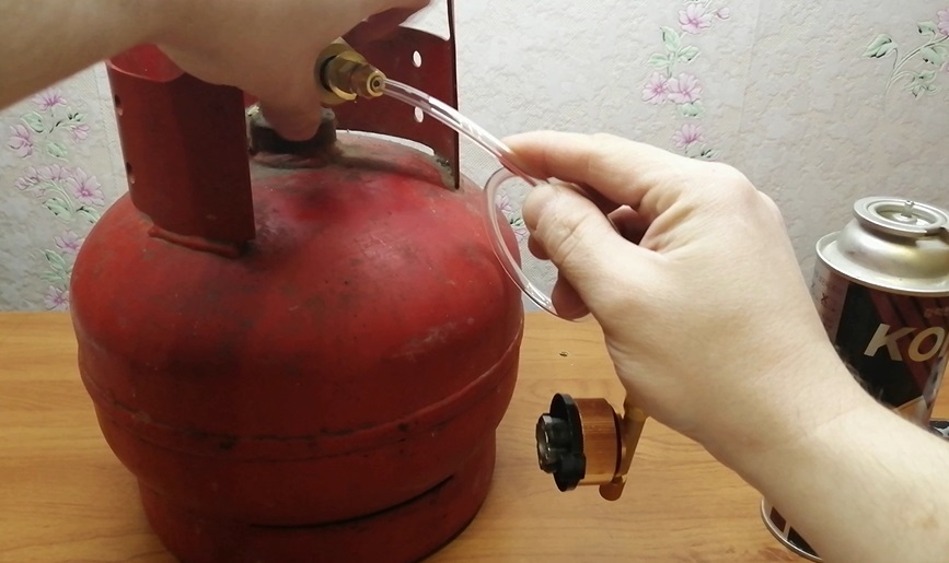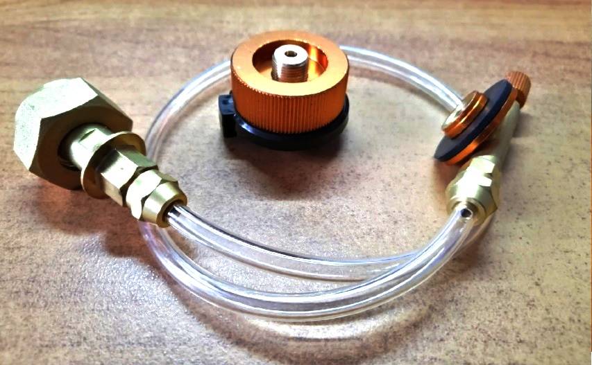 Конструкция этого приспособления следующая: трубка, выполненная из полимера или металлического сплава, с одной стороны оснащена накидной гайкой. Она обеспечивает герметичное прикрепление к большому баллону с газом, а с другой стороны имеется цанговый зажим с ручкой, которая открывает или закрывает поступление газа в баллончик.