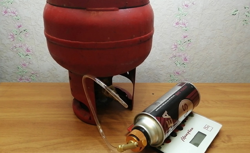 С помощью аналогичной системы можно заправлять небольшие туристические газовые баллоны. Понадобится переходник, весы, пустой баллон, бытовой баллон с газом. Взвешивают пустую емкость. Поочередно накручивают переходник на баллоны, открывают кран и начинают заливку газа.