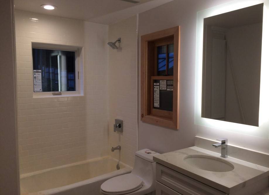 В этом случае изделие должно быть изготовлено из влагоустойчивого материала. Подсветка будет предотвращать появление конденсата на зеркале.