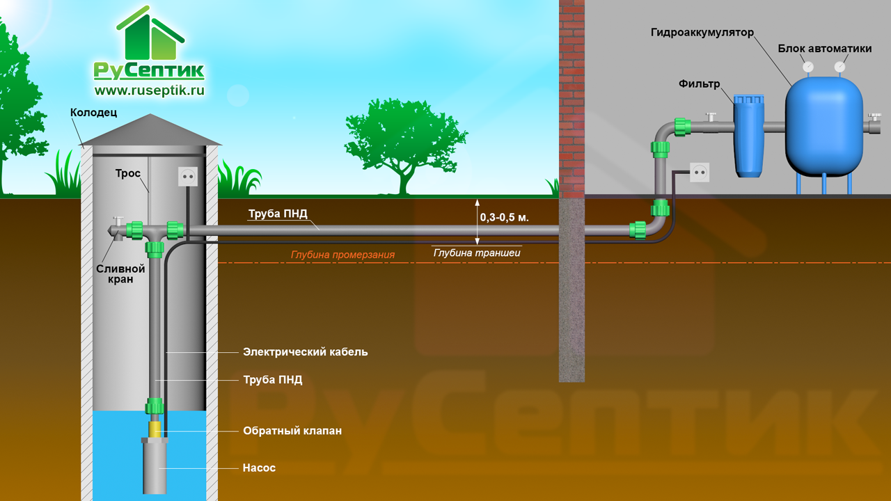 Для устройства водопровода, который будет выполнять свою основную функцию — снабжение водой круглый год, необходимо выбрать один из двух вариантов: